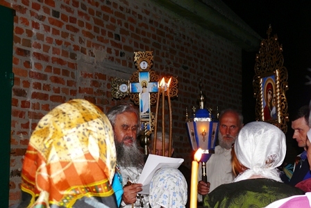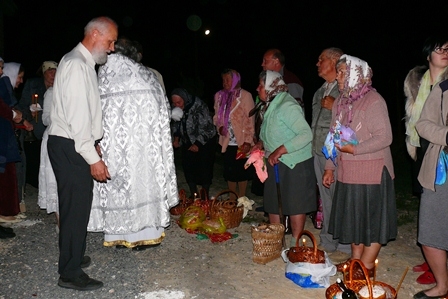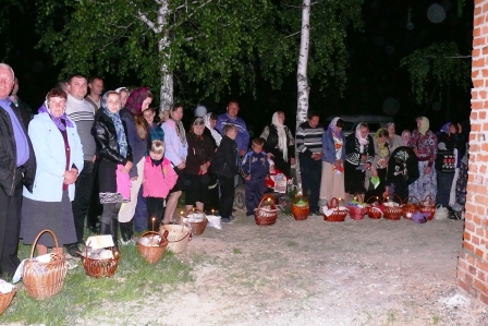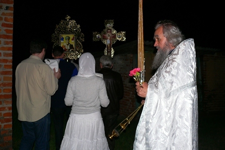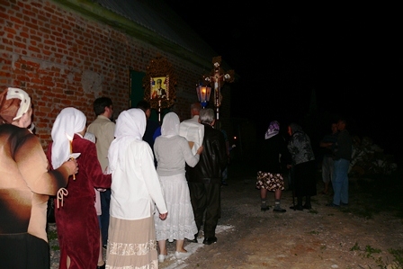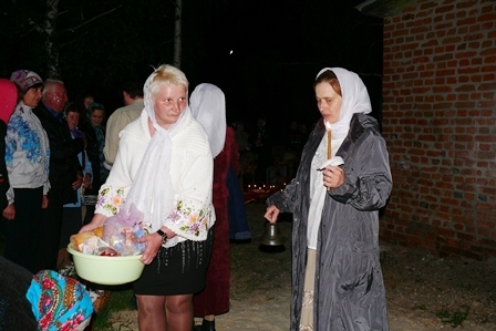 Святая ночь. Все, пришедшие на праздник, с зажженными свечами, вместе с о. Сергием, одетым в белые ризы, с крестом, иконами и хоругвями вышли из храма, чтобы крестным ходом обойти вокруг него и прийти к закрытым дверям, обозначающим одновременно и запечатанный гроб и двери Царства Небесного, закрытые до момента Воскресения.