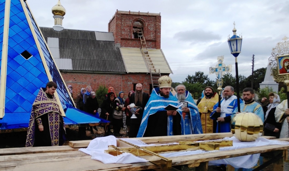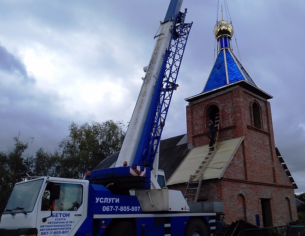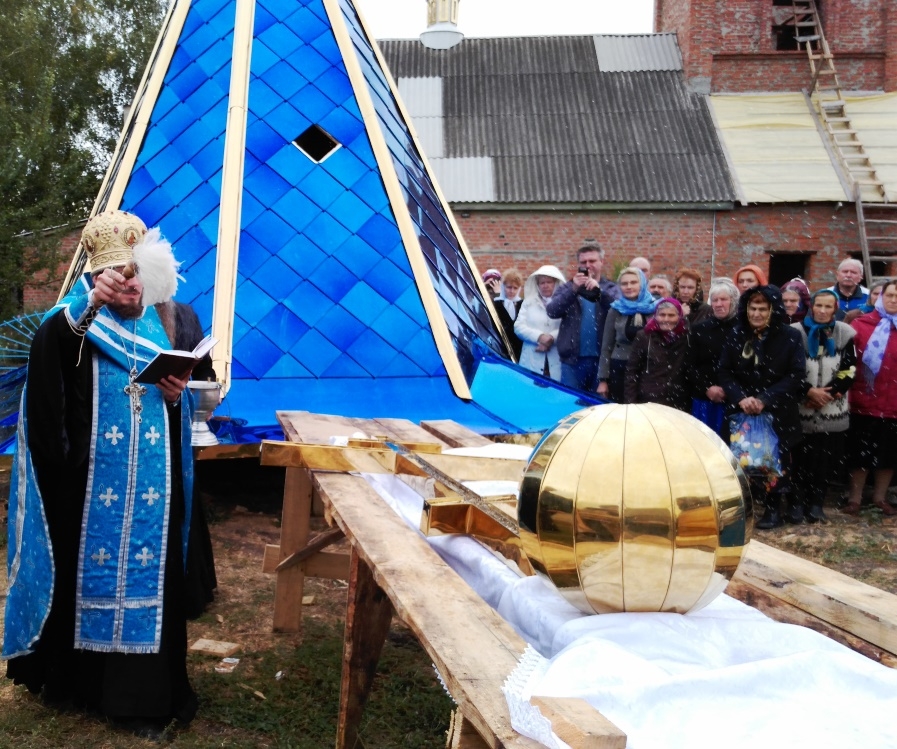Установка купола и креста на вновь построенную колокольню храма Рождества Пресвятой Богородицы с. Константовка.